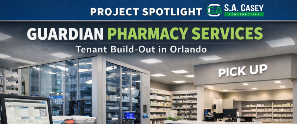 S.A. Casey Construction, Inc. is proud to announce the successful completion of the tenant build-out renovation for Guardian Pharmacy Services, located in Orlando, Florida. This ambitious project involved transforming a 20,000 square foot space into a state-of-the-art pharmacy that meets the needs of both the business and its customers.